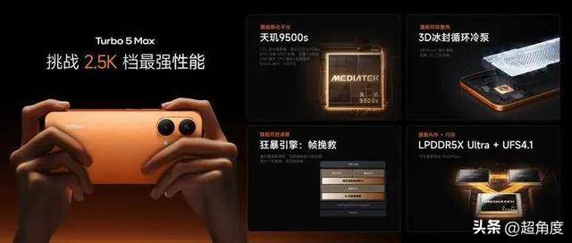 Turbo 5 Max 全球首发天玑 9500s,采用 3nm制程工艺,第二代全大核架构设计,内置 8 核1+3+4三簇全大核 CPU 和 12 核 GPU。CPU缓存+ 系统缓存达 29MB 超大规模,晶体管数高达近 300 亿,是真正的满血正代旗舰芯,实测安兔兔 V11 跑分超 361 万。