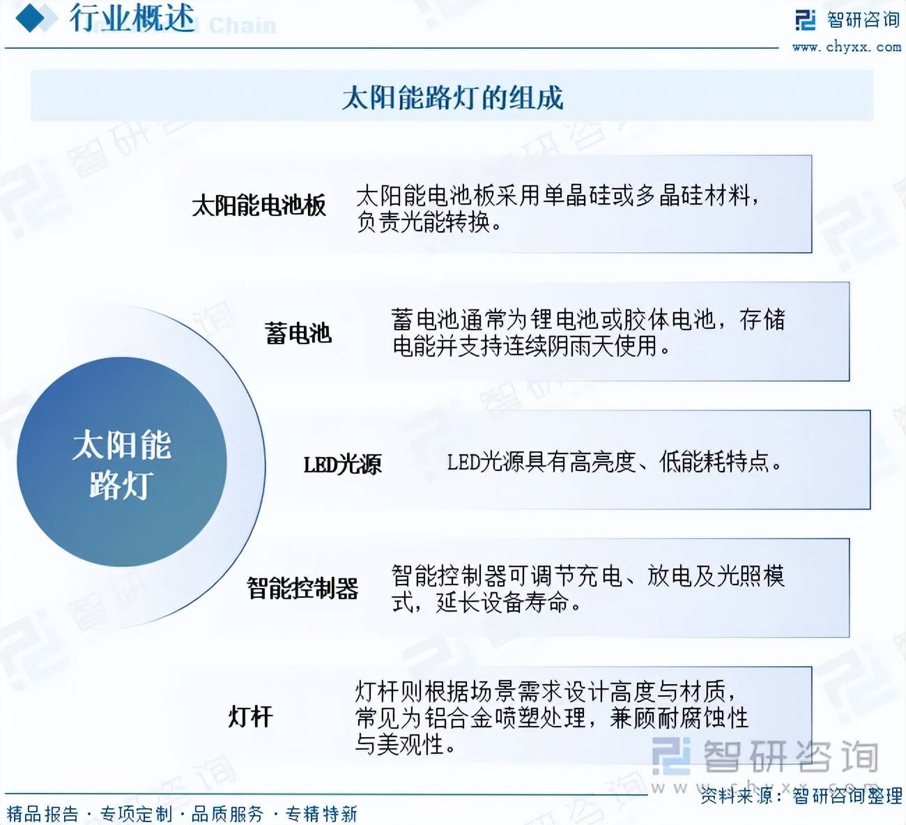 太阳能路灯产业链主要包括上游原材料供应、中游的制造和组装以及下游应用。上游原材料主要包括太阳能电池板、锂电池、LED灯珠、智能控制器、钢材、热镀锌钢管、铝合金、玻璃、塑料等。产业链中游为太阳能路灯的制造和组装环节。产业链下游为应用领域,包括公园、广场、景区、住宅小区、城乡道路等场所。